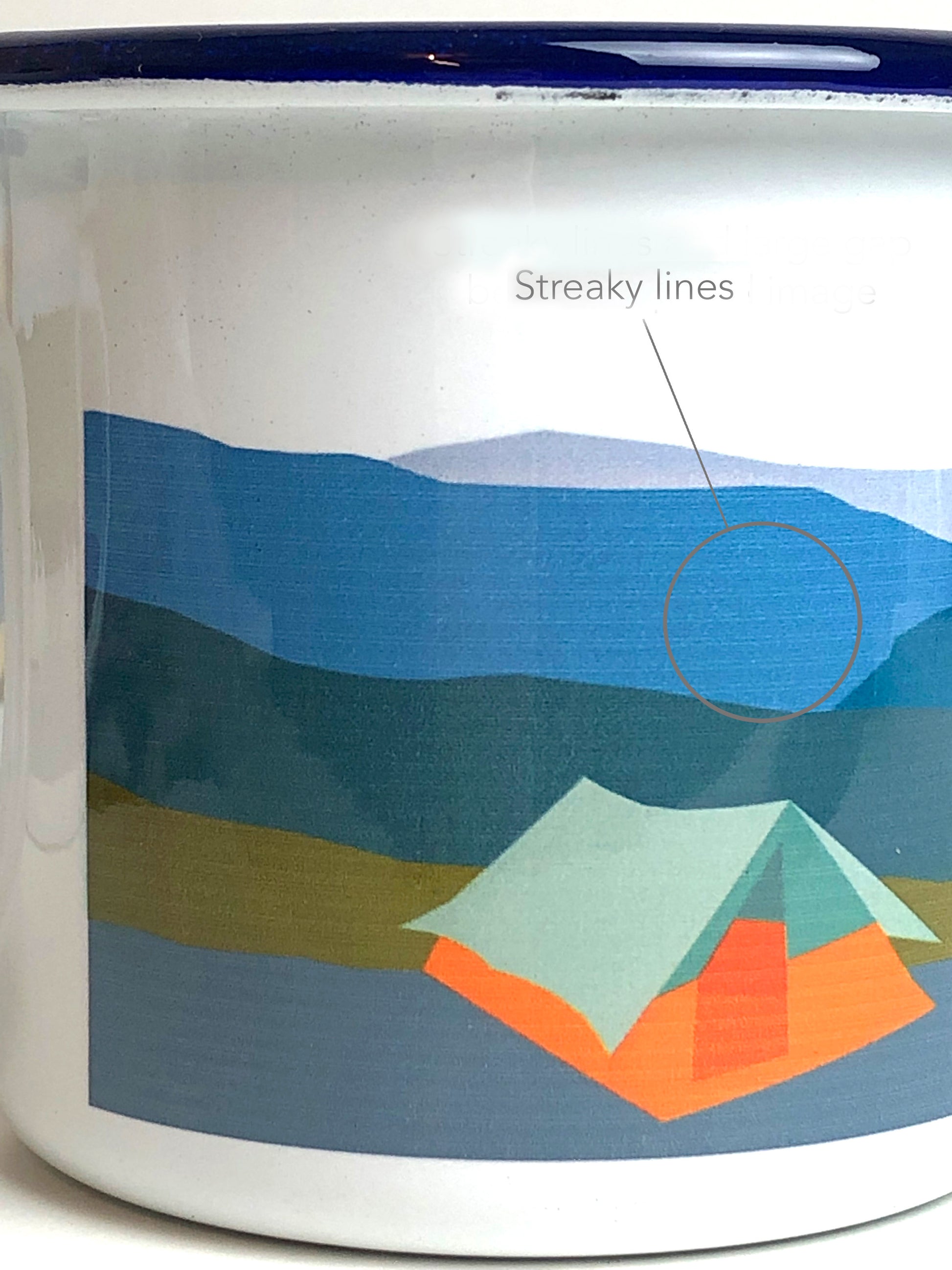 These are miss printed enamel mugs. As you can see from the close up photo, there are subtle lines running through the design. Although it's not very obvious, i don't feel comfortable selling these at full price. Size and enamel quality the same as full priced mugs.