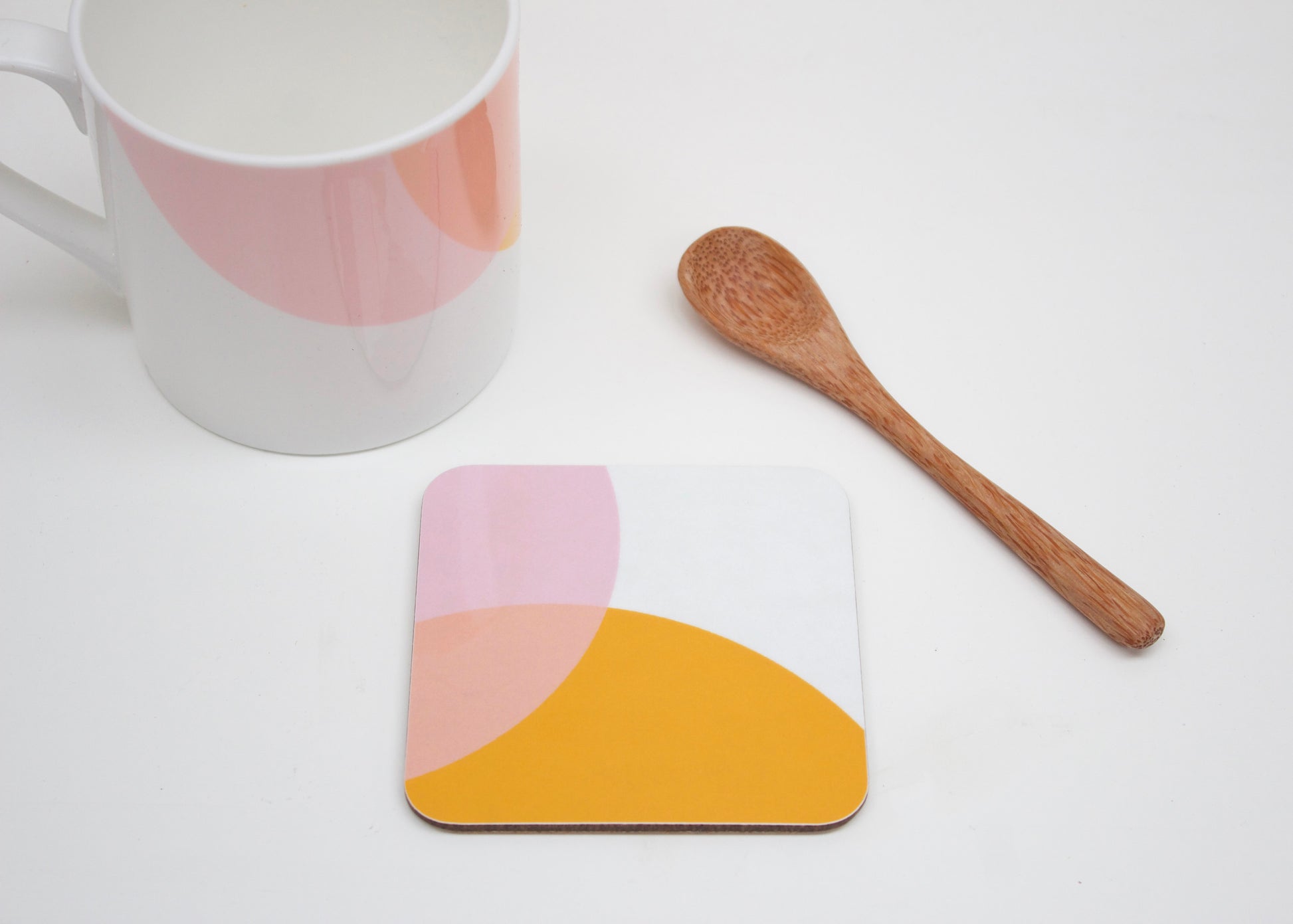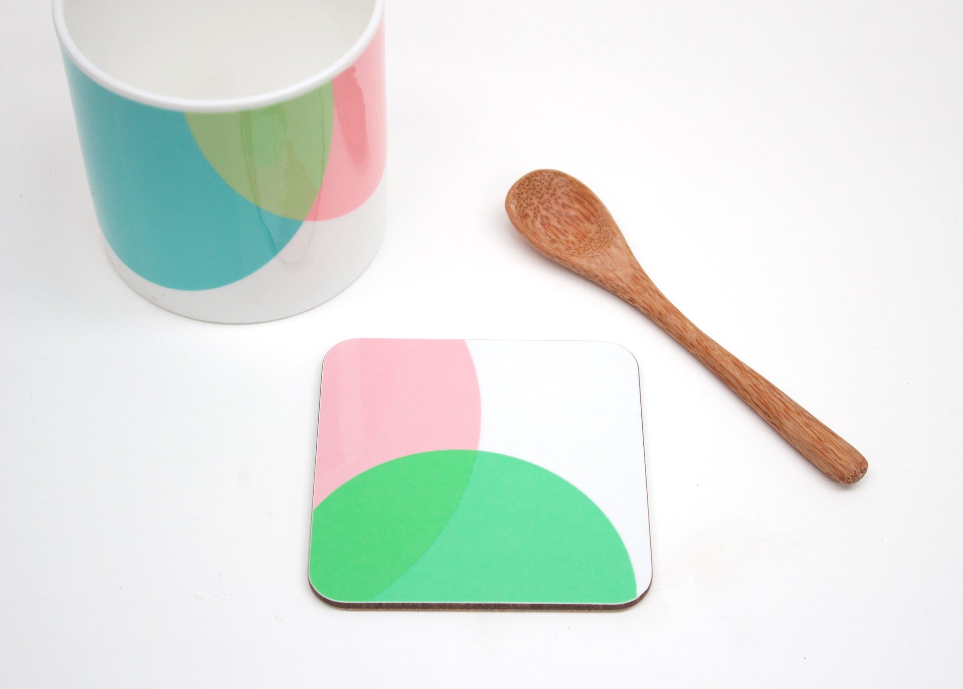 The Dip Collection is inspired by the process where ceramic is dipped in slip adding colour and texture to the surface. The overlap of colour is also influenced by my experience of screen printing and layering colours. The lovely light and fresh feel collection consists of Bone China Mugs, Coasters and Placemats