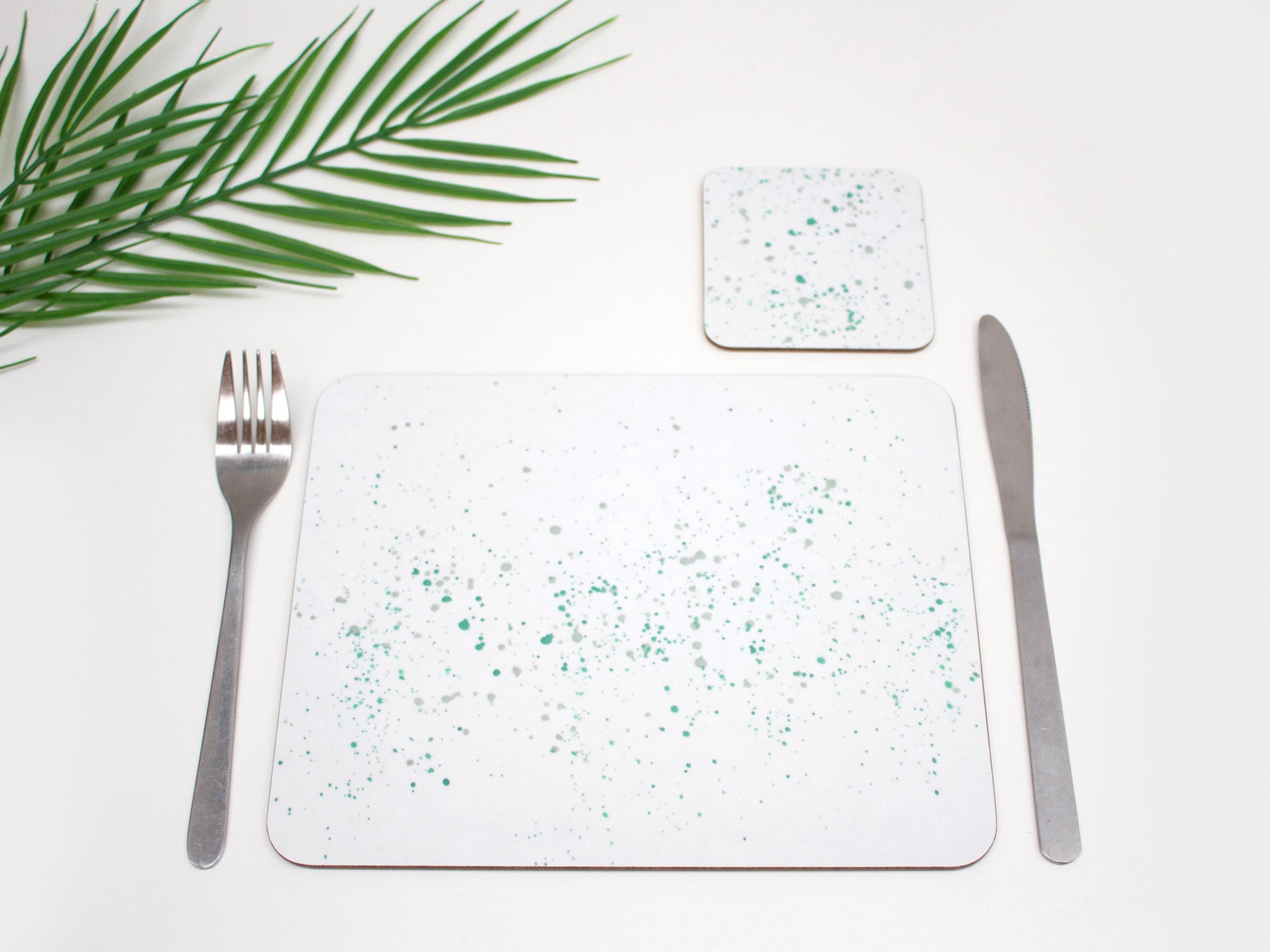 The specks of colour are dotted randomly around the placemat. Inspired from paintings I made recently, the paintings have been transferred onto the placemats in my Bristol Studio.
